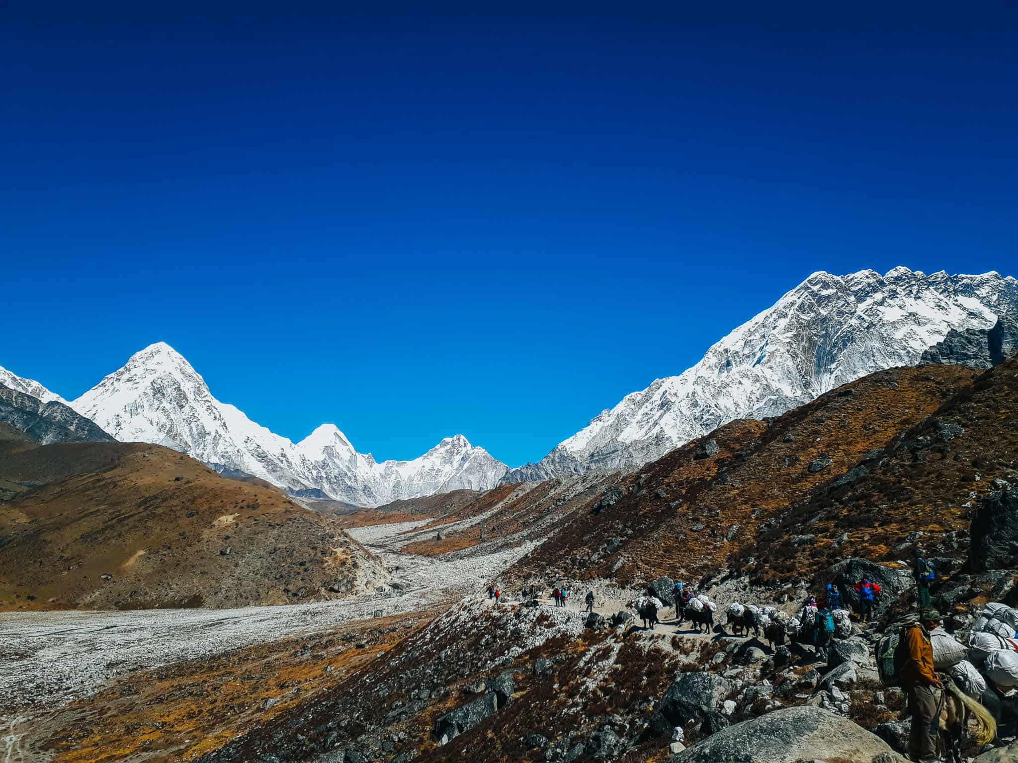 Dingbochesta vaellusreitti kulkee ylös Pherichen laaksoa kohti Duglan (Thukla) kylää, jonka kautta kuljemme 4900-metrin korkeudessa sijaitsevaan Lobuchen kylään. Vaelluspäivän aikana ohitamme Cholatsen ja Tabuchen vuoret. Luonto sekä vuoristokylät alkavat muuttumaan ylävuoristoon kuljettaessa karummaksi, mutta näkymät lähes kosketusetäisyydellä sijaitseville 7000-8000m huipuille ovat upeat. Yöpyminen paikallisessa majatalossa. (A, L, I)